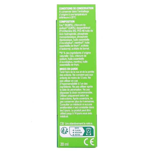 Eau (93,86 %), Chlorure de Sodium (3,05 %), Dexpanthenol (2 %), Hydroxystéarate de Macrogolglycerol, Phosphate de Dihydrogène Potassique, Phosphate D’Hydrogène Dipotassique, Huile essentielle D’Eucalyptus, Menthol, Acétate de Bornyl, Acétate D’Isobornyl, Huile essentielle de Thym.