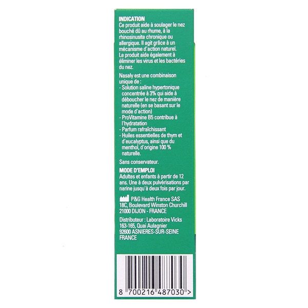 Nasaly Nez Bouché Spray Nasal un traitement permettant de retrouver une respiration libre et apaisée. Les laboratoires Vicks ont spécialement conçu ce produit pour répondre aux besoins des personnes ayant le nez obstrué. Grâce à sa formule unique, il débouche efficacement les narines tout en prenant soin de votre muqueuse nasale.