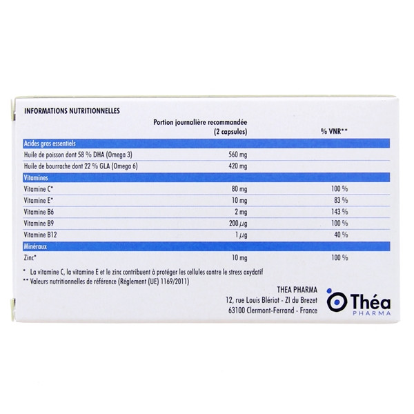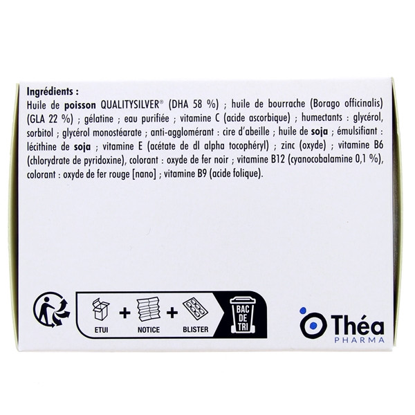 Huile de poisson QUALITYSILVER (DHA 58%), huile de bourrache (Borago officinalis) (GLA 22%), gélatine, eau purifiée, vitamine C (acide ascorbique), glycérol (épaississant), sorbitol (humectant), glycérol monostéarate (émulsifiant), cire d'abeille (anti-agglomérant), huile de soja (émulsifiant), lécithine de soja (émulsifiant), vitamine E (acétate de dl alpha tocophéryl), zinc (oxyde), vitamine B6 (chlorhydrate de pyridoxine), oxyde de fer noir (colorant), vitamine B12 (cyanocobalamine 0,1ù), oxyde de fer rouge (colorant), vitamine B9 (acide folique).