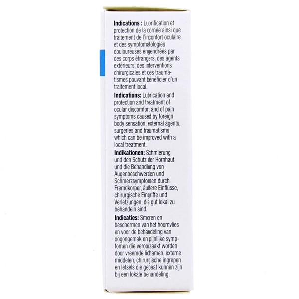 Lubrification et protection de la cornée ainsi que traitement de l’inconfort oculaire et des symptomatologies douloureuses engendrées par des corps étrangers, des agents extérieurs, des interventions chirurgicales et des traumatismes pouvant bénéficier d’un traitement local.