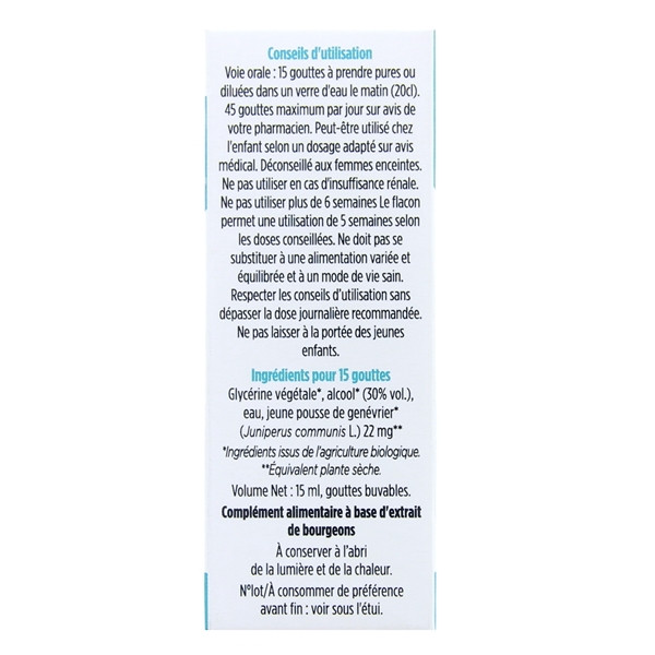 Prenez entre 5 et 15 gouttes par jour de cet Extrait de Bourgeons de Genévrier Bio Vitaflor. Diluez-les dans un verre d’eau. Le mélange est à consommer quotidiennement avant les repas.