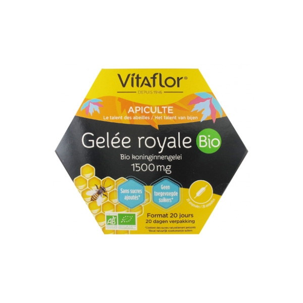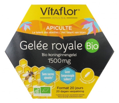 Vitaflor Gelée Royale 1500 mg Bio est une solution à base de gelée royale issue de l'agriculture biologique. La gelée royale est reconnue pour son action sur le renforcement du système immunitaire et pour son pouvoir revigorant et stimulant.