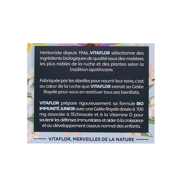 BioImmunité Junior de Vitaflor est un complément alimentaire à base de 700 mg de Gelée Royale Bio, d'Échinacée Bio et de vitamine D. Il soutient les défenses immunitaires, aide à la croissance et au développement osseux normal des enfants. BioImmunité est prévu pour un programme de 14 jours, renouvelable notamment aux changements de saison.