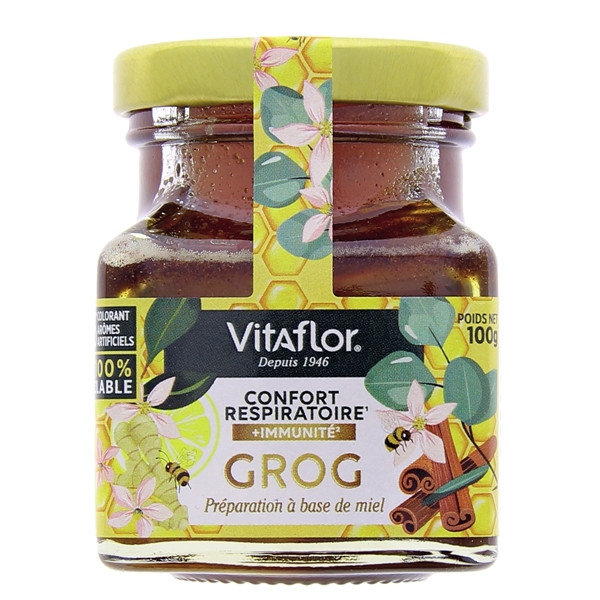 Vitaflor Préparation pour Grog est la préparation incontournable pour l'hiver. Composée de Miel, Jus de Citron, Cannelle, Eucalyptus et Gingembre, cette préparation va vous aider à lutter contre les rhumes et maux de gorge, et les coups de froids.