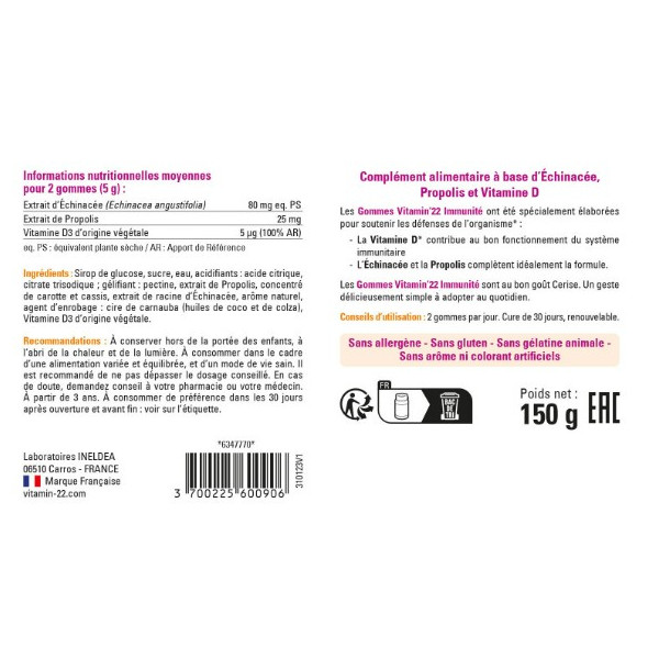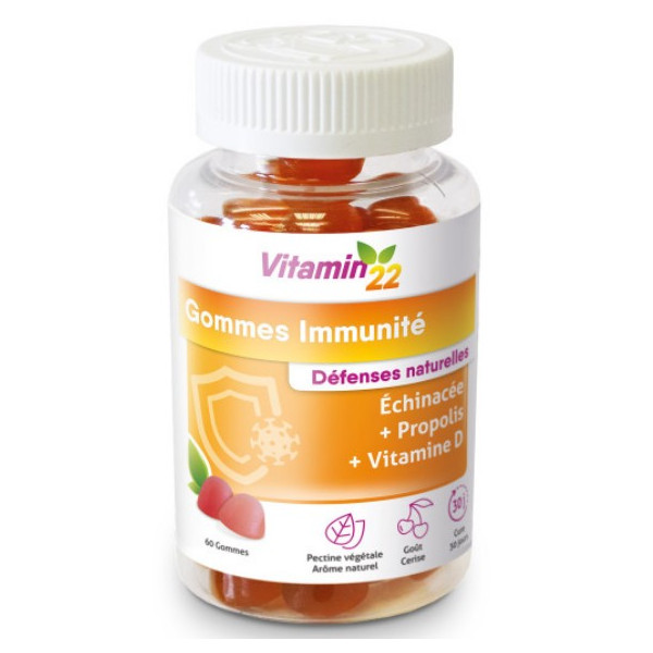 Les Gommes Immunité au délicieux goût de cerise de la marque Vitamin'22 contiennent de la Propolis, de l'Echinacée et de la Vitamine D pour booster les défenses immunitaires.