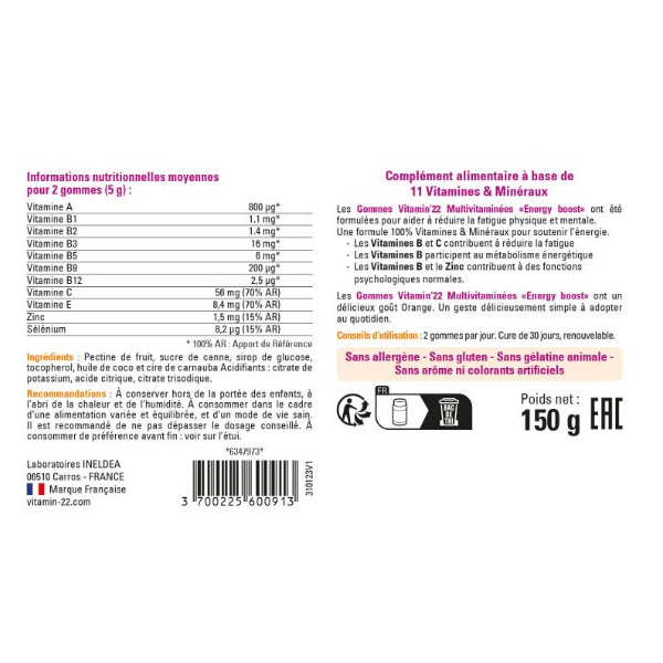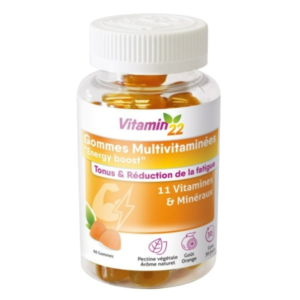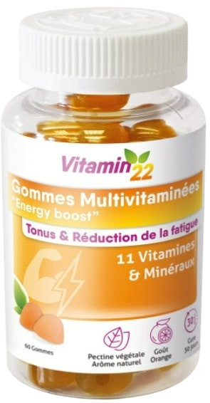 Les Gommes Multivitaminées au délicieux goût d'orange de la marque Vitamin'22 contiennent 11 vitamines et minéraux pour réduire la fatigue physique et mentale.