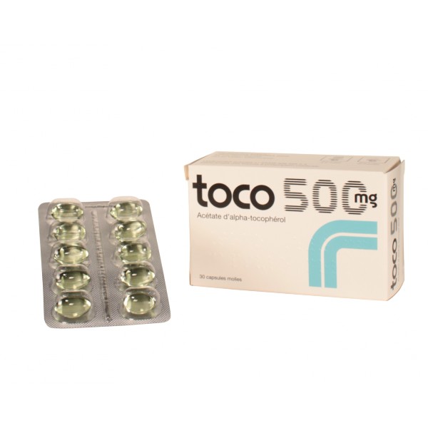 Toco 500mg est un médicament indiqué dans les carences en vitamine E. L'achat en ligne du médicament Toco 500mg est permise car il ne nécessite pas d'ordonnance. La consultation de la notice reste toutefois obligatoire et l'avis d'un médecin fortement recommandé. Notre pharmacie en ligne IllicoPharma propose le médicament Toco en boîte de 10 capsules molles dosées à 500mg.