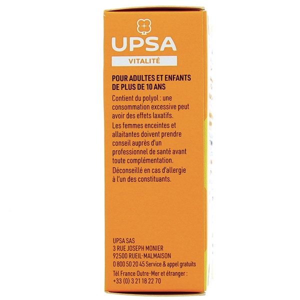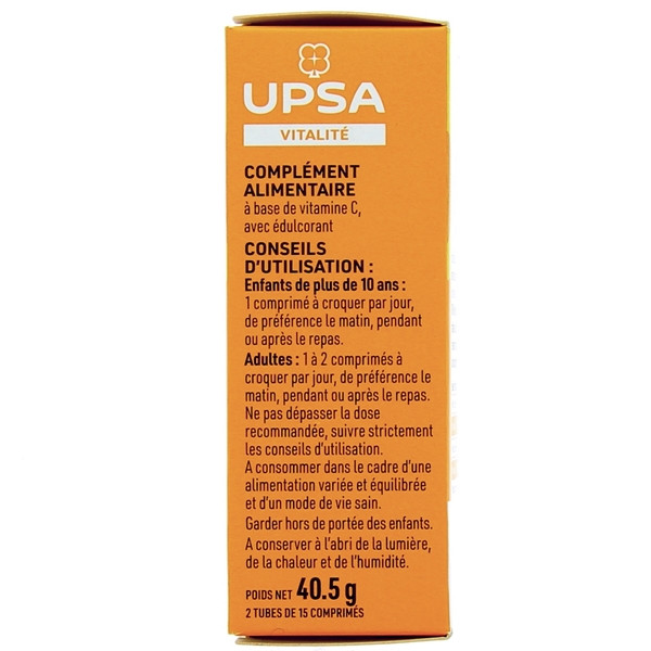 Le complément alimentaire Vitalité Vitamine C 500 mg développé par le laboratoire UPSA est sous forme de comprimé à croquer au goût d'orange. Il est destiné aux adultes et aux enfants de plus de 10 ans.