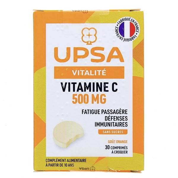Le complément alimentaire Vitalité Vitamine C 500 mg du laboratoire UPSA est indiqué pour contribuer à un métabolisme énergétique normal, réduire la fatigue et contribuer au fonctionnement normal du système immunitaire.