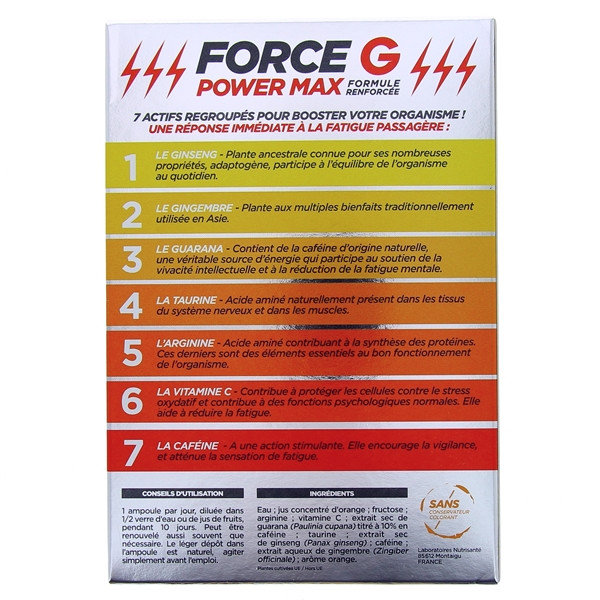 Présenté sous forme de 20 ampoules individuelles, Force G Power Max se caractérise par une utilisation simple et rapide. Ce complément alimentaire s’adresse aux adultes actifs qui recherchent un soutien efficace et naturel pour maintenir leur niveau d’énergie.