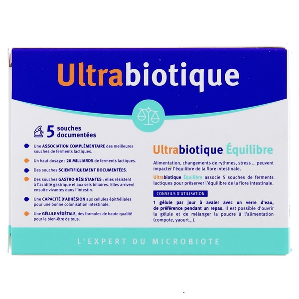 - Ultrabiotique Equilibre, produit entièrement naturel, renferme 5 souches principales de ferments lactiques. Celles-ci lui permettent de maintenir l'équilibre de la flore intestinale, de réguler votre tube digestif et de renforcer les défenses immunitaires.