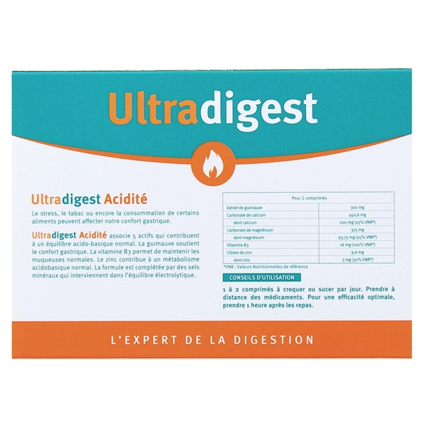Le complément alimentaire Ultradigest Acidité de la marque Vitavea associe 5 actifs qui contribuent à un équilibre acido-basique normal. Il permet de maintenir les muqueuses normales et un confort gastrique.