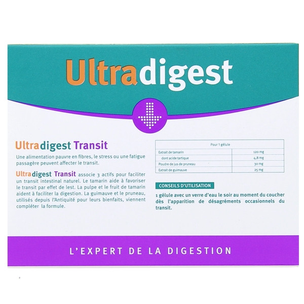 Ultradigest Transit permet de soutenir et faciliter le transit intestinal de façon douce. Il est formulé à base d’actifs naturels dont la poudre de pruneau, l’extrait de tamarin et l’extrait de guimauve.