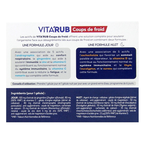 Vita'Rub Coups de Froid du laboratoire Vitavea permet de soutenir l'organisme face aux désagréments liés aux coups de froid en associant deux formules : une formule Jour et une formule Nuit.