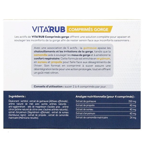 - Mode d’emploi : laisser fondre lentement dans la bouche 2 à 4 comprimés Vita’Rub Maux de Gorge par jour.