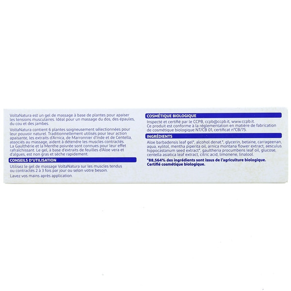 Voltanatura Gel de massage est indiqué pour apaiser et rafraîchir les muscles tendus, contractés et fatigués. Ce gel peut être utilisé pour les tensions dans le dos, les épaules, le cou ou toute autre zone musculaire dues à une activité physique ou à de longues heures de travail. Certifié biologique, ce gel embarque une texture qui sèche rapidement et ne colle pas. Sa formulation embarque une combinaison unique de 6 extraits de plantes et d’huiles essentielles :