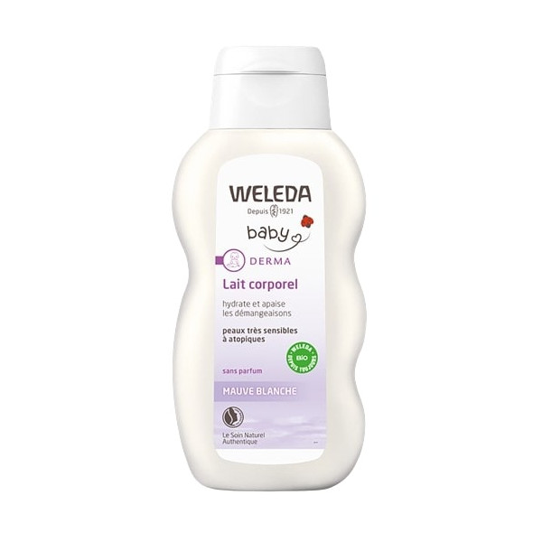 Le lait corporel à la Mauve blanche de Weleda offre une formule naturelle, calmant et adoucissant les démangeaisons sur la peau très sensible à atopique de bébé.