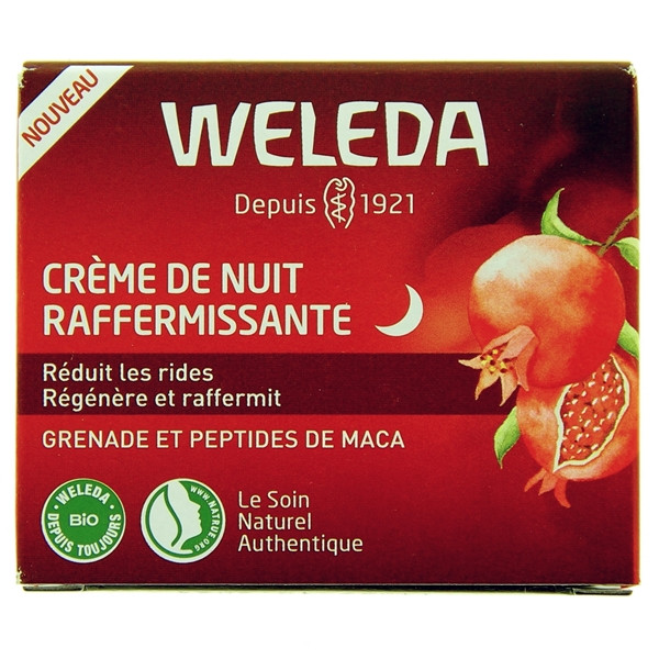 La crème de nuit raffermissante Weleda Grenade et Maca Bio est un soin pour adulte fabriqué par le laboratoire Weleda. Cette enseigne est un pionnier du cosmétique naturel et biologique depuis 1921.