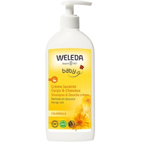 La crème lavante Corps et Cheveux au Calendula Bio du laboratoire Weleda permet de nettoyer délicatement les cheveux et en douceur la peau fragile des bébés. Sa base lavante végétale est douce et elle ne pique pas les yeux.