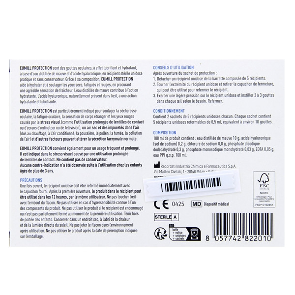 Ce produit se distingue par sa formule sans conservateurs pour une utilisation douce et sécurisée. En associant acide hyaluronique et extrait de mauve, Eumill Protection hydrate intensément la surface oculaire tout en apaisant les sensations d’inconfort.