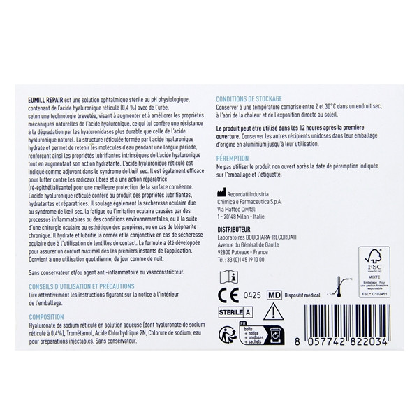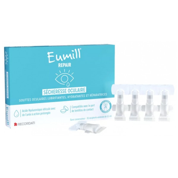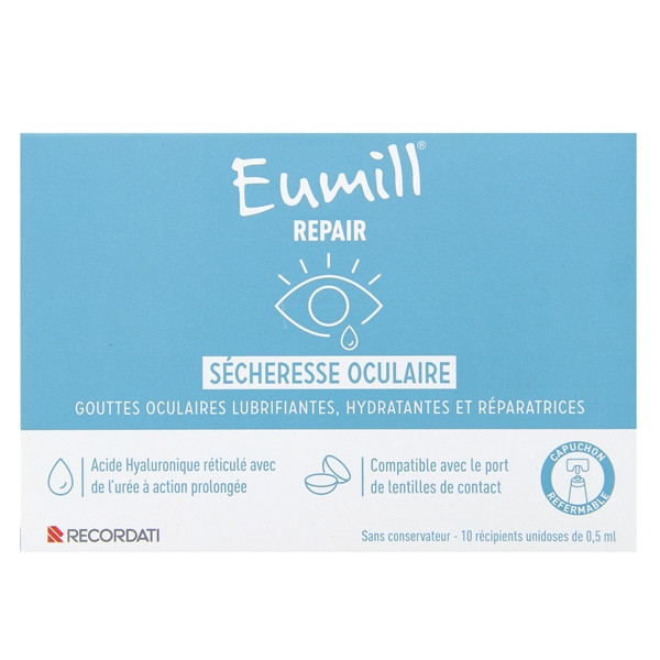Eumill repair sécheresse oculaire est disponible en monodoses de 0,5 ml et en flacon de 10 ml sur notre site internet. Gouttes oculaires lubrifiantes, hydratantes et réparatrices.