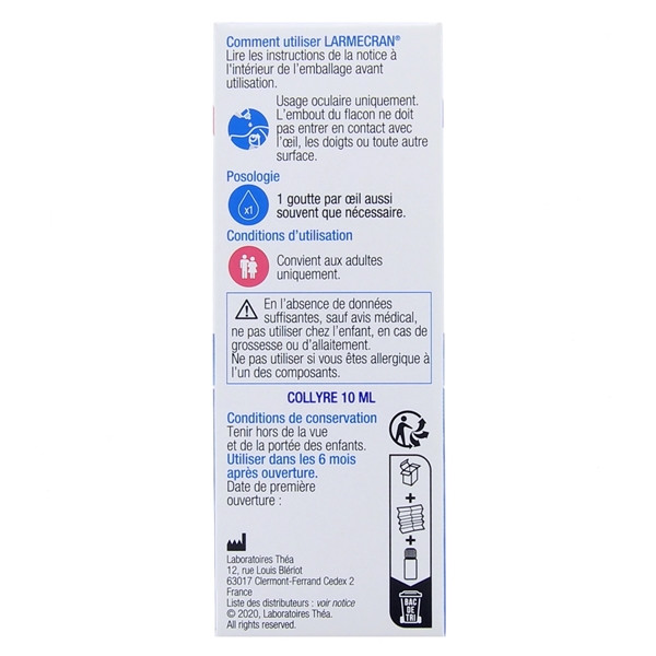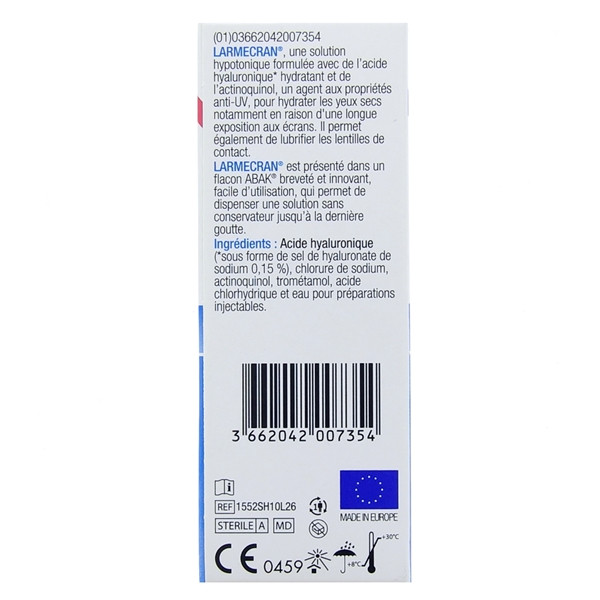 Larmecran des laboratoires Théa est une solution oculaire spécialement formulée avec de l'acide hyaluronique hydratant et de l'actinoquinol, un agent aux propriétés anti-UV, pour hydrater les yeux secs et lubrifier les lentilles de contact.