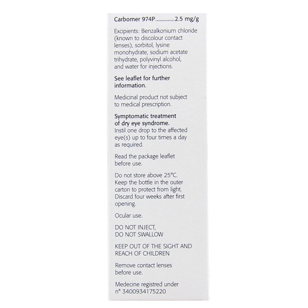 Un trouble visuel bref peut survenir après instillation du produit, jusqu'à ce que le gel se répartisse uniformément à la surface de l'œil.