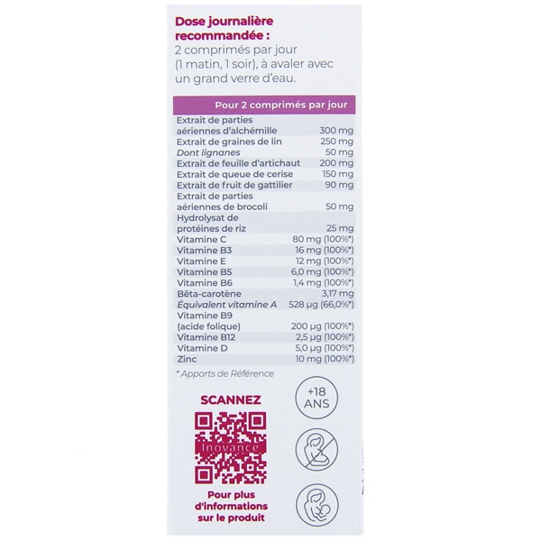 Extrait de parties aériennes d’alchemille (Alchemilla vulgaris), extrait de graines de lin (Linum usitatissimum) titré à 20 % de lignanes, anti-agglomérant : cellulose microcristalline ; extrait de feuille d’artichaut (Cynara scolymus), extrait de queue de cerise (Prunus cerasus), anti-agglomérant : phosphate dicalcique ; extrait de fruit de gattilier (Vitex agnus-castus), acide L-ascorbique (vitamine C), extrait de parties aériennes de brocoli (Brassica oleracea italica), anti-agglomérant : phosphate tricalcique ; enrobage (agent d’enrobage : hydroxypropylméthylcellulose ; anti-agglomérant : cellulose microcristalline ; émulsifiant : acide stéarique) ; citrate de zinc, anti-agglomérant : sels de magnésium d’acides gras ; hydrolysat de protéines de riz, acide ptéroylmonoglutamique (vitamine B9), succinate acide de D-alpha tocopheryl (vitamine E), nicotinamide (vitamine B3), bêta carotène, D-pantothénate de calcium (vitamine B5), cholécalciférol (vitamine D), chlorhydrate de pyridoxine (vitamine B6).