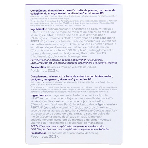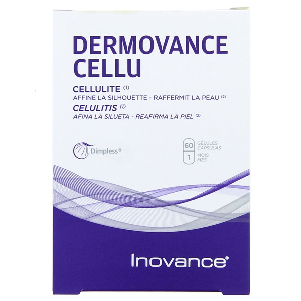 Inovance Dermovance Cellu contient des extraits de marc de raisin et de pépins de raisin. Ils possèdent des vertus minceur, mais limitent surtout l’apparition des cellulites en agissant directement sur le tissu adipeux, sur le cholestérol et sur la tonicité veineuse. Sa formule comprend également des extraits de gotu kola qui agissent sur la circulation sanguine, et des extraits de feuille d’orthosiphon. Ce complément alimentaire contient aussi du melon connu pour sa capacité à réduire la rétention d’eau et à éliminer les toxines et l’eau en excès. En outre, Inovance Dermovance Cellu renferme du collagène, du manganèse et des vitamines C et B3.
