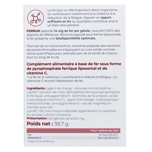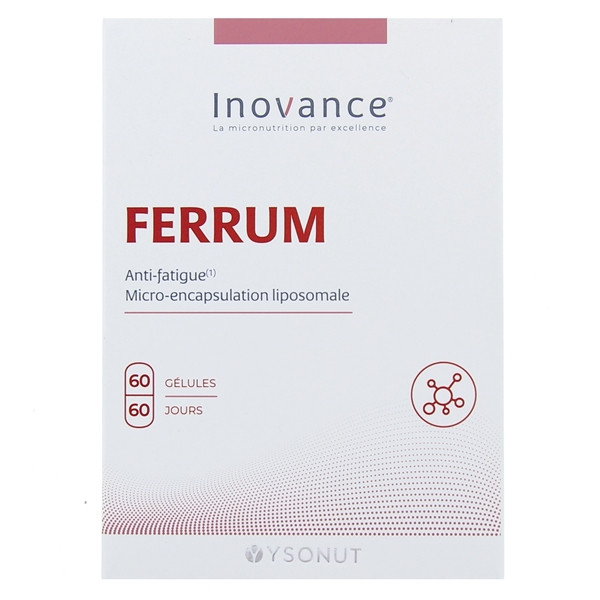 Fabriqué en France par les laboratoires Ysonut, Inovance Ferrum est conditionné en boite de 60 gélules.