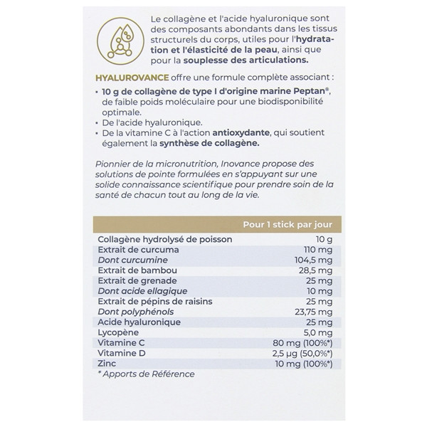 Inovance Hyalurovance x15 sticks est un complément alimentaire présenté sous forme de solution soluble et buvable. Il s’agit d’un supplément élaboré par les laboratoires Ysonut et faisant partie de la gamme Inovance.
