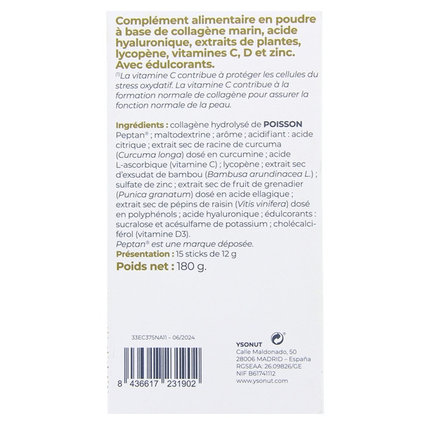 Collagène hydrolysé de poisson Peptan® ; maltodextrine ; arôme ; acidifiant [acide citrique] ; extrait sec de racine de curcuma (Curcuma longa) dosé en curcumine ; acide L-ascorbique (vitamine C) ; lycopène ; extrait sec d’exsudat de bambou (Bambusa arundinacea L.) ; sulfate de zinc ; extrait sec de fruit de grenadier (Punica granatum) dosé en acide ellagique ; extrait sec de pépins de raisin (Vitis vinifera) dosé en polyphénols ; acide hyaluronique ; édulcorants [sucralose, acésulfame de potassium] ; cholecalciférol (vitamine D3).