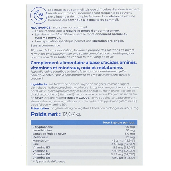Inovance Noctivance du laboratoire Ysonut est un complément alimentaire à base d’acides aminés, vitamines et minéraux, noix et mélatonine. Il aide à réduire le temps d'endormissement et favorise le fonctionnement normal du système nerveux.