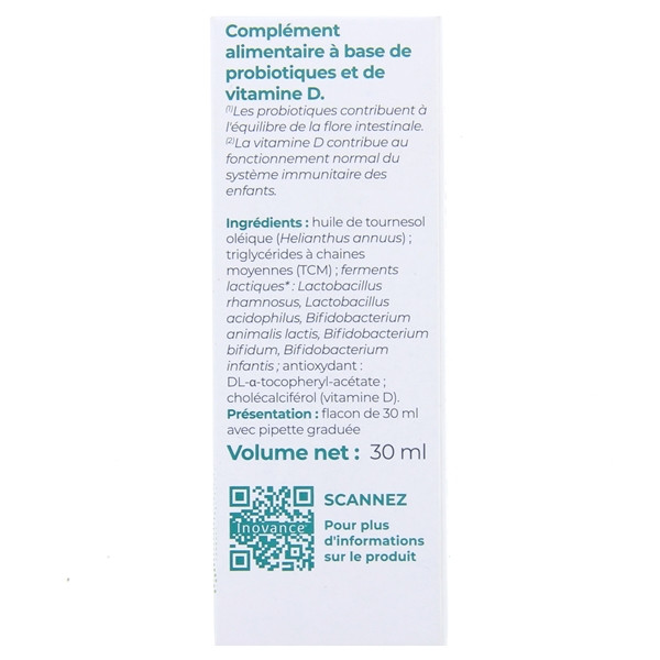 De fabrication française, ce produit prêt à l'emploi et au gout neutre est disponible sous forme de flacon de 30 ml accompagné d’une pipette graduée pour une administration plus simple. Il contient une base formée d’huile et d’inuline bio offrant plus de stabilité et de protection aux souches lactiques. Cela dispense de la nécessité de le conserver au froid.