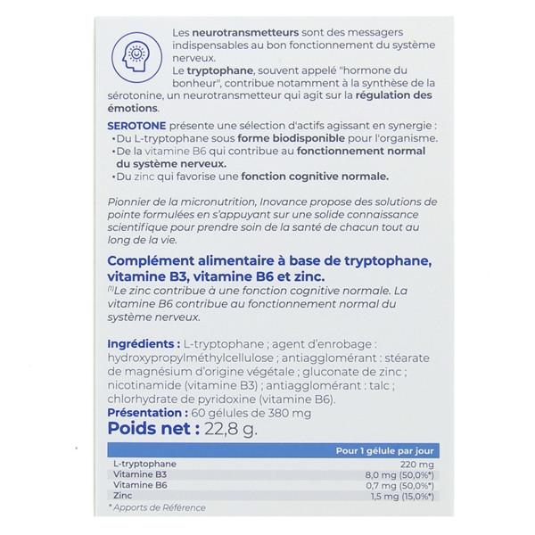 Inovance Serotone du laboratoire Ysonut est un complément alimentaire à base de tryptophane, vitamines B3-B6 et zinc. Il contribue au fonctionnement normal du système nerveux et favorise une fonction cognitive normale.