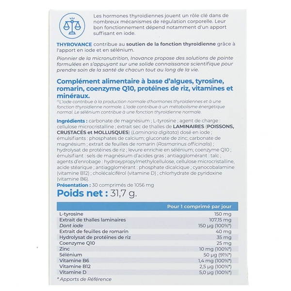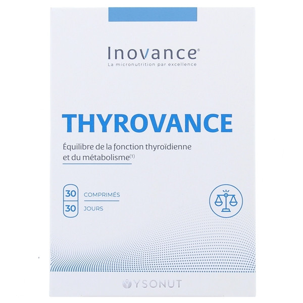 Inovance Thyrovance du laboratoire Ysonut est un complément alimentaire à base d’algues, tyrosine, romarin, coenzyme Q10, protéines de riz, vitamines et minéraux. Il contribue au soutien de la fonction thyroïdienne et à l'équilibre du métabolisme.