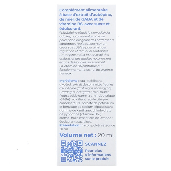 Eau ; stabilisant : glycérol ; extrait de sommités fleuries d’aubépine (Crataegus monogyna, Crataegus laevigata) ; miel toutes fleurs ; acide gamma aminobutyrique (GABA) ; acidifiant : acide citrique ; conservateurs : sorbate de potassium et benzoate de sodium ; épaississant : gomme de xanthane ; chlorhydrate de pyridoxine (vitamine B6) ; arôme : huile essentielle de lavande ; édulcorant : sucralose.