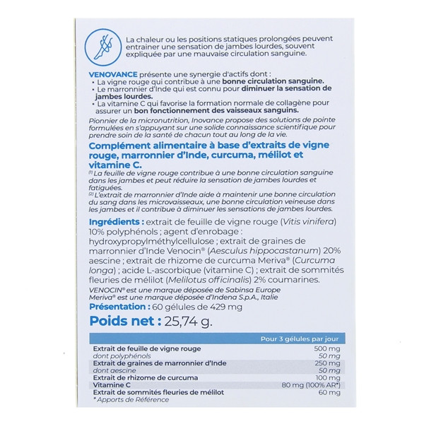 Inovance Venovance du laboratoire Ysonut est un complément alimentaire à base d’extraits de vigne rouge, marronnier d'Inde, curcuma, mélilot et vitamine C pour contribuer à une bonne circulation sanguine et diminuer la sensation de jambes lourdes.