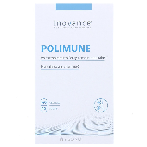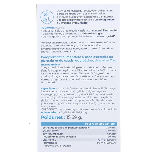 Inovance Polimune du laboratoire Ysonut est un complément alimentaire à base d'extraits de plantain et de cassis, quercétine, vitamine C et manganèse pour contribuer au confort des voies respiratoires et au bon fonctionnement du système immunitaire en cas d'allergie saisonnière.
