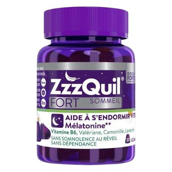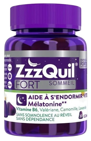 ZzzQuil Fort Sommeil ne contient ni arôme, ni colorant, ni édulcorant, ni conservateur artificiel. Il est également exempt de lactose et de gluten. De plus il ne crée aucune forme de dépendance. Son arôme délicieux de fruits des bois rend sa consommation agréable. Il est conditionné en flacon de 30 gommes.
