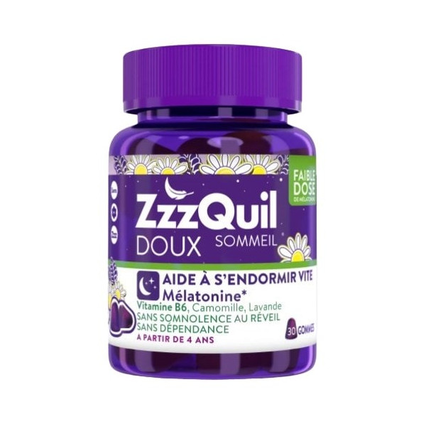 ZzzQuil Doux Sommeil est un complément alimentaire qui contient une faible dose de mélatonine pour favoriser un endormissement rapide. Il garantit un réveil sans somnolence.